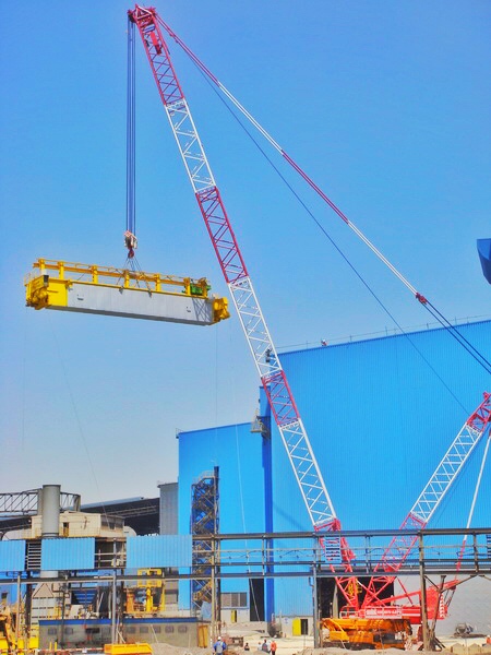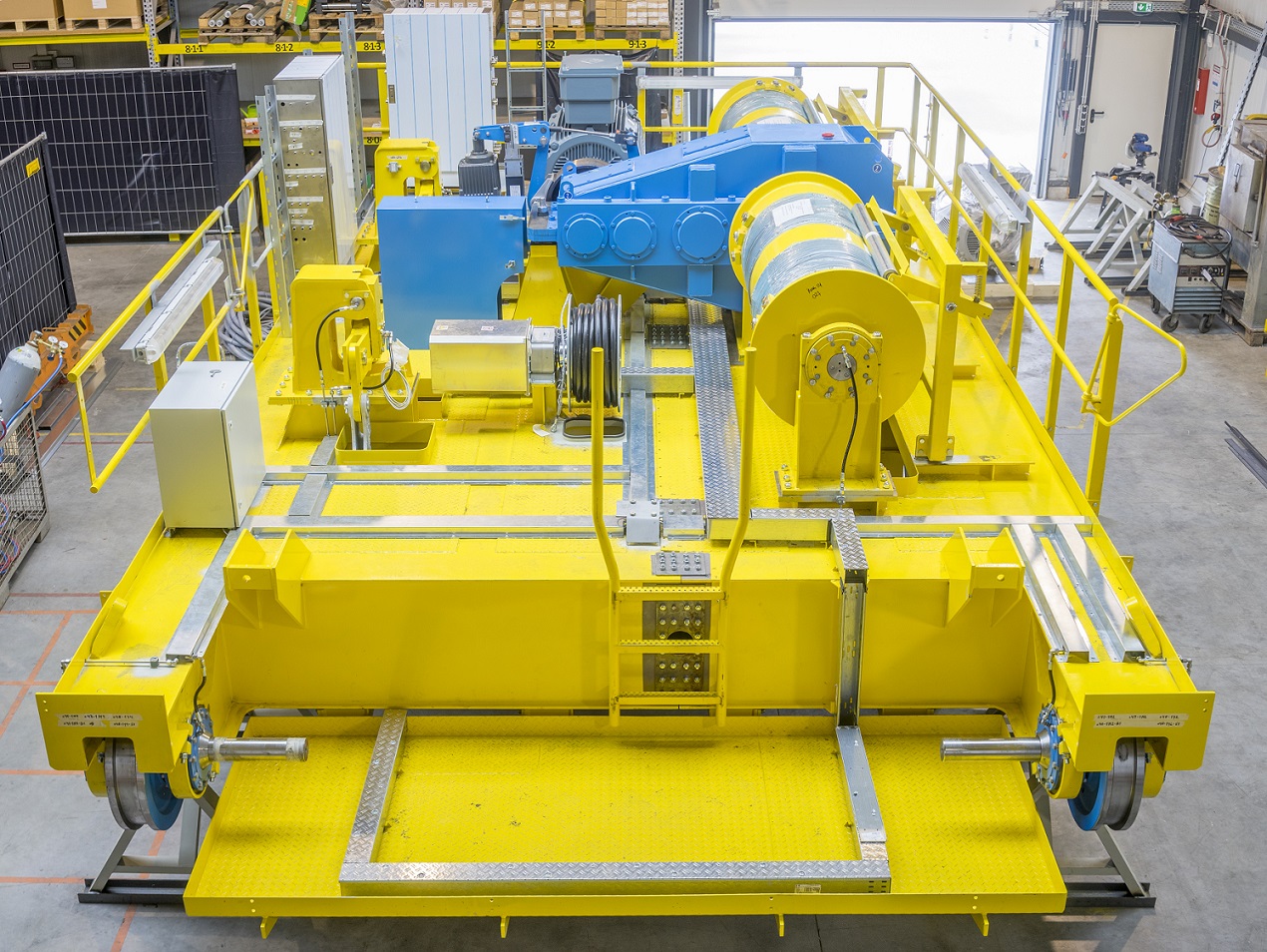 Das untere Bild, stellt den Zusammenbau der Katze im Herstellerwerk in Freystadt des Brammentransportkrans dar.